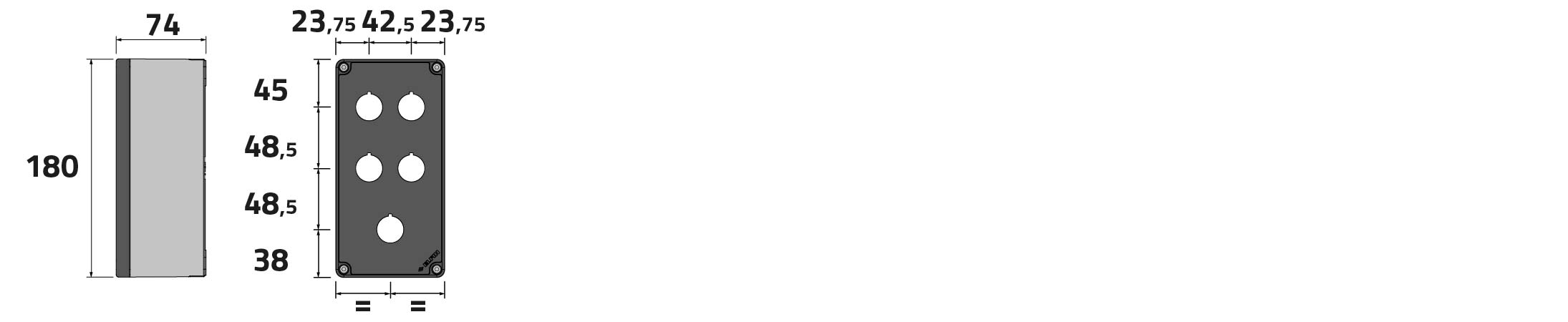 Drucktastergehäuse in PA + Glasfaser 90x180x74, 5 Bohrungen d22, UL