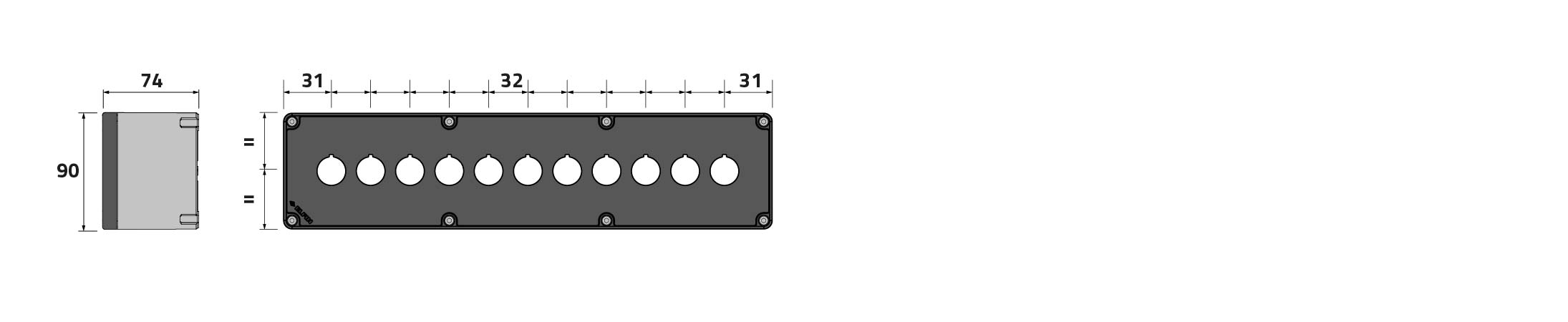 Drucktastergehäuse in PA + Glasfaser 90x382x74, 11 Bohrungen d22