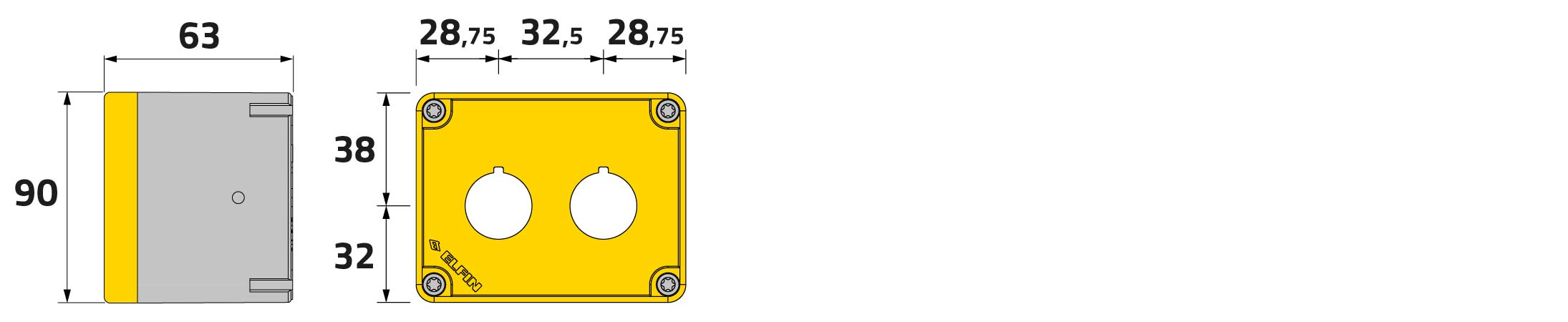 Caja pulsadora in PA + fibra de vidrio 70x90x63, 2 orificios d22, amarillo