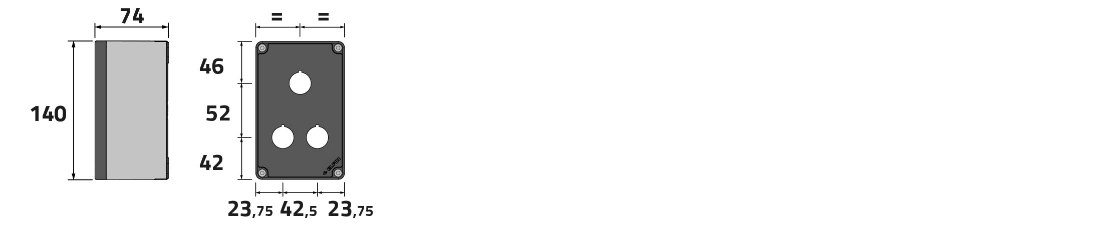 Caja pulsadora in PA + fibra de vidrio 90x140x74, 3 orificios d22