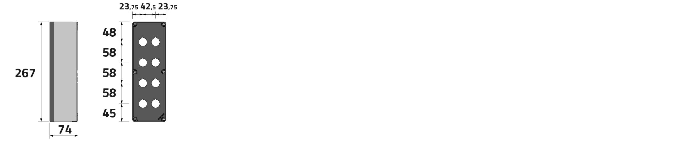 Caja pulsadora in PA + fibra de vidrio 90x267x74, 8 orificios d22