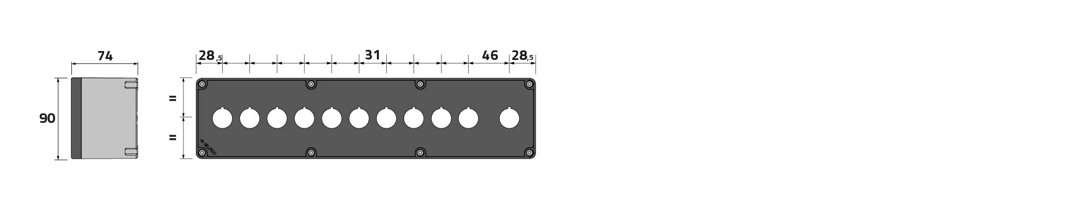 Caja pulsadora in PA + fibra de vidrio 90x382x74, 11 orificios d22, UL