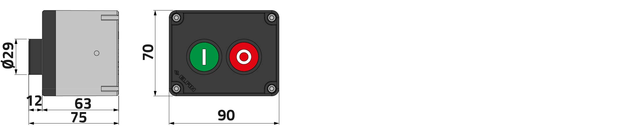 Boîte à boutons in PA + fibre verre 70x90x63 avec 2 boutons I-O gardés, UL