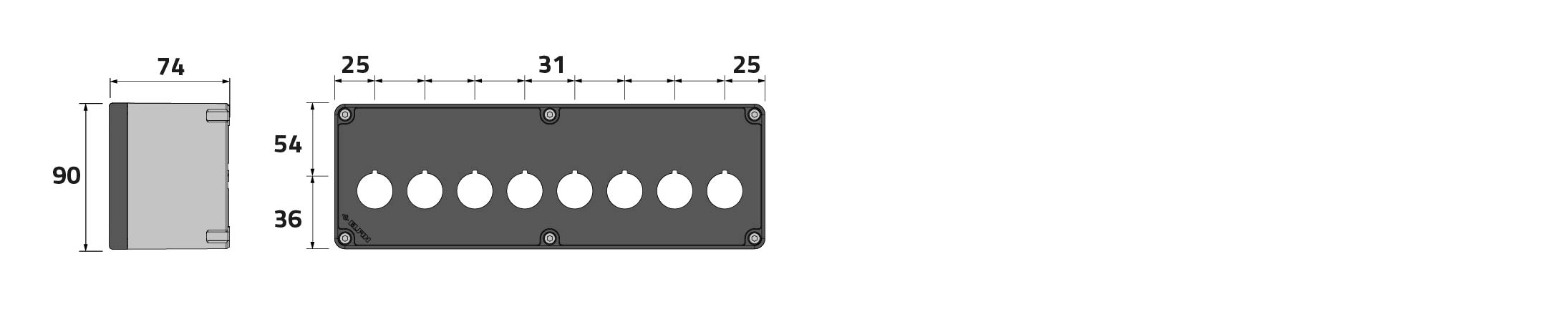 Boîte à boutons in PA + fibre verre 90x267x74, 8 trous d22, UL
